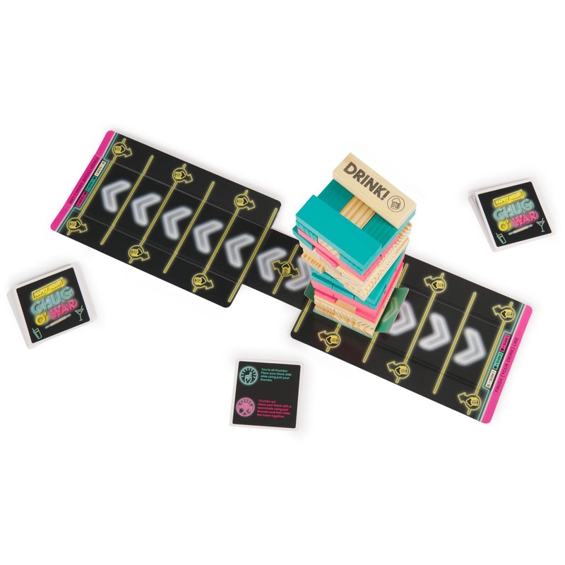 - DRINK AND DRAG: If you or a teammate successfully completes the challenge, carefully slide the tower towards your side of the game board. The first team to reach the “cheers” square wins