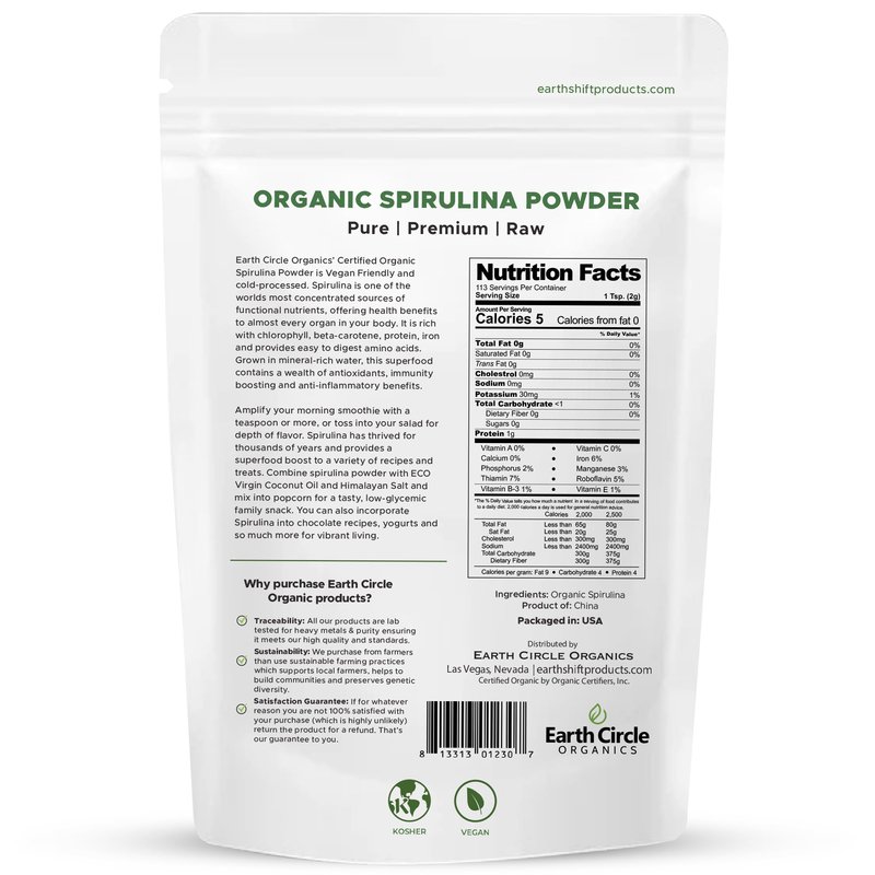 - ✅Spirulina is an all-around Superfood, with a unique flavor and deep green color. Spirulina is a blue-green algae cultivated in clean fresh water and natural sunlight. Amplify your morning smoothie with a teaspoon or more, or toss into your salad for depth of flavor. Spirulina has thrived for thousands of years and provides a Superfood boost to a variety of recipes and treats. Add and enjoy nourishment to family recipes with ECO’s Spirulina Powder.