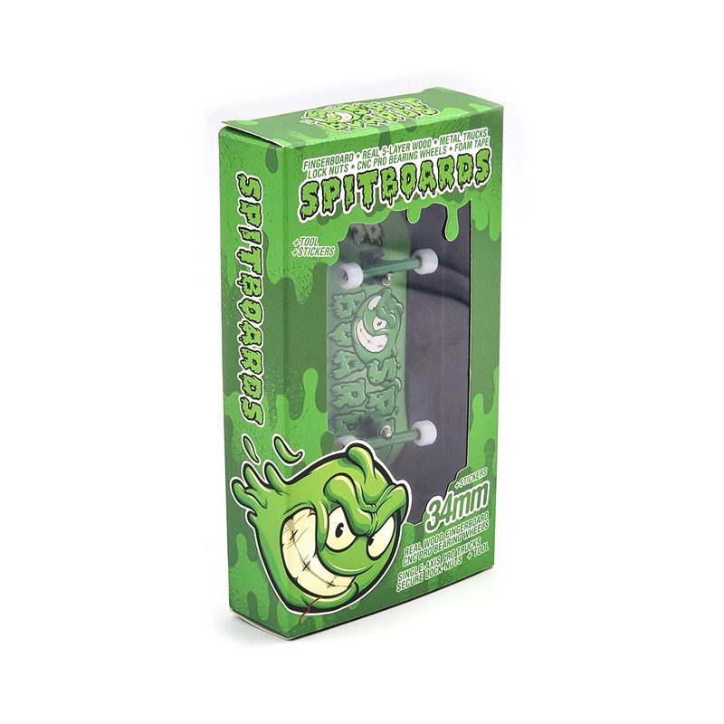 SPITBOARDS 34mm x 96mm Pro Fingerboard Set-Up (Complete) | Real Wood Deck | Pro Trucks with Lock-Nuts and Pro Bushings | Polyurethane Pro Wheels with Bearings | Logo (Green Version)