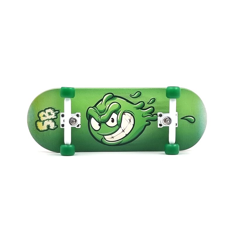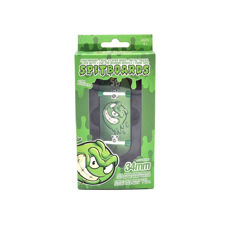 SPITBOARDS 34mm x 96mm Pro Fingerboard Set-Up (Complete) | Real Wood Deck | Pro Trucks with Lock-Nuts and Pro Bushings | Polyurethane Pro Wheels with Bearings | Slimeball (Green Version)