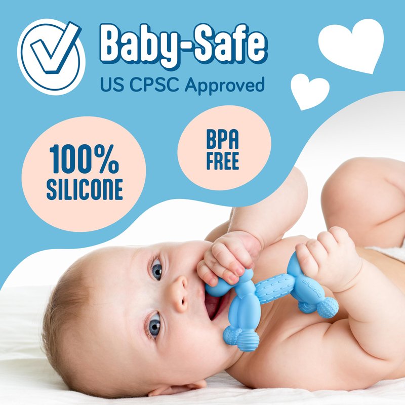 - SAFETY FOR YOUR PEACE OF MIND: 100% silicone teethers for babies, no BPA, certified as both a teether and a pacifier according to the US CPSC standards. The teething toy is hypoallergenic, durable, and easy to clean. The infant teether guards the baby’s well-being, right from day one