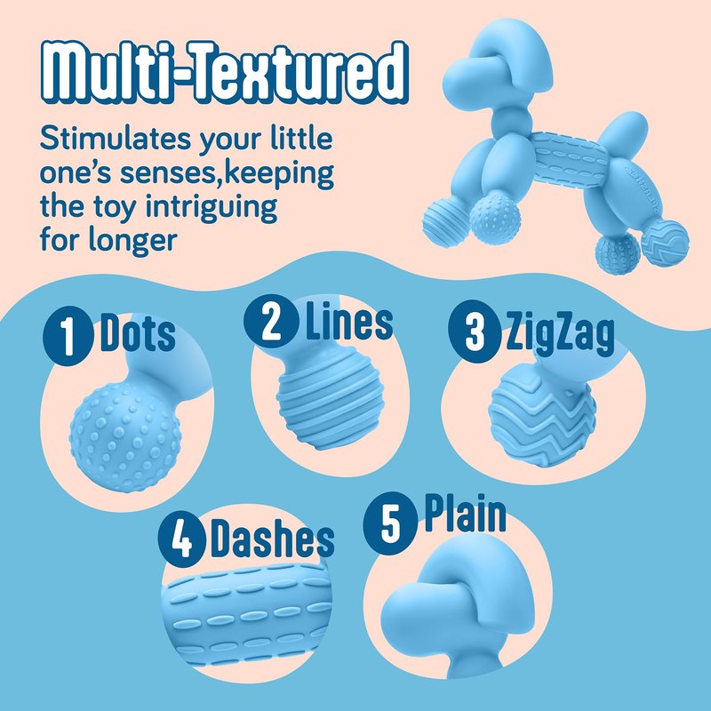 - A SENSORY JOURNEY THROUGH DIFFERENT TEXTURES. Teething toys 6-12 months engage and stimulate your baby’s senses and make teething intriguing. With 5 types of textures, our baby teethers 6 to 12 months promise amusement and comfort for your little one