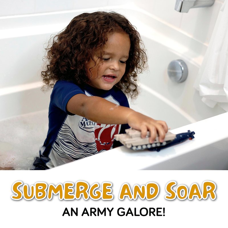 - A WILD TIME - Make water play wildly fun with SplashEZ bath toys! Your baby bath 12-18 months set includes 3 adorable Army-themed dolls - an airplane, a submarine, and a tank!