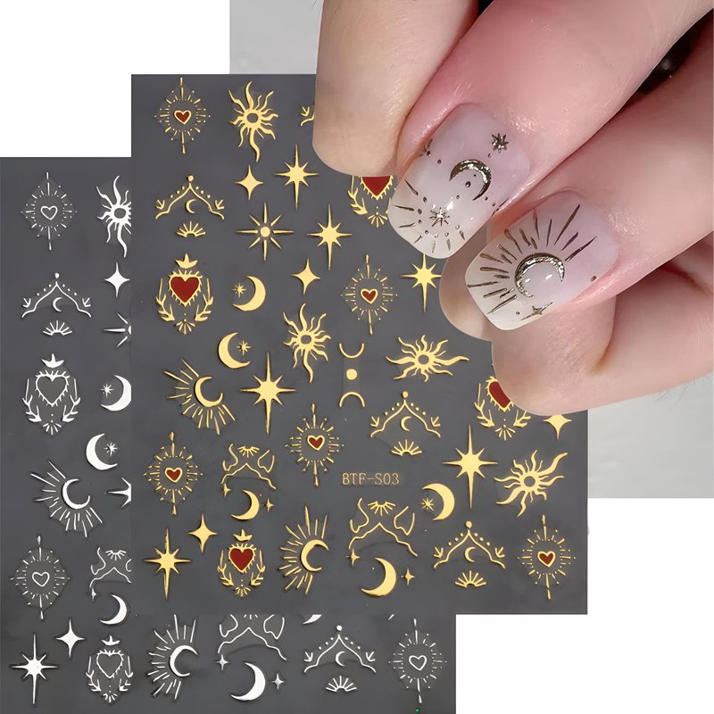 SPLOCUDU 12 Sheets Star Nail Stickers for Nail Art 3D Self-Adhesive Nail Art Stickers Gold Silver Sun Moon Heart Nail Art Design Decoration Accessories for Women