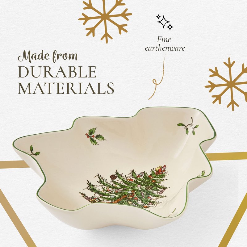 - Crafted from fine earthenware, this 9-inch Christmas tree-shaped serving bowl adds a delightful charm to every table and makes a perfect Christmas home decor piece.