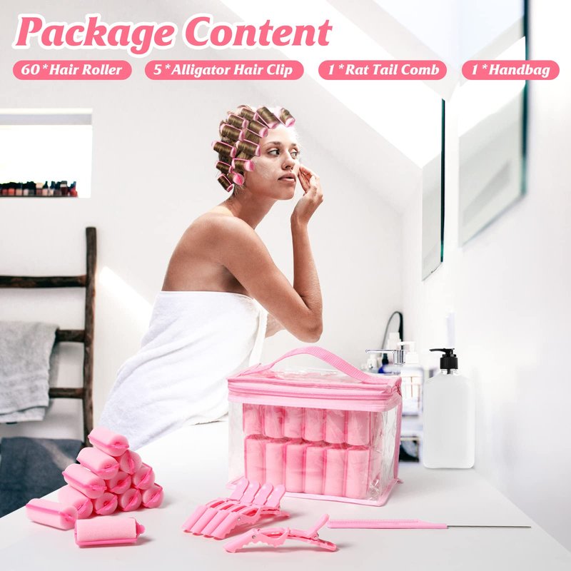 - ✅Package Includes: 60 pieces sponge hair rollers. (Length: 2.8inch * Diameter: 0.98inch). Alligator Hair Clips*5, Rat Tail Comb*1. Handbag*1.