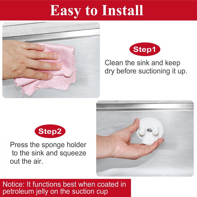 - 【Strong Suction Cup.】The sponge holder could suction to any clean, smooth surfaces like mirrors, glass, tiles, stainless steel plates, iron plates, aluminium plates and plastic plates. It functions best when coated in petroleum jelly on the suction cup especially for stainless steel sinks. 【Note:】Painted Wall, Rough Surface and Wallpaper are not applicable surfaces.