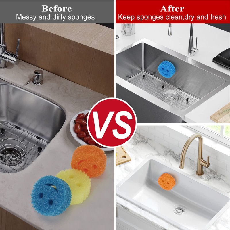 - 【Space Saving with Compact Size.】The sponge holder neatly mounts anywhere in your sink, freeing up counter space! This sponge holder saves you from having to worry about the messy and wet sponges on your kitchen or bathroom sink. All your sponges will be in order on your sink.