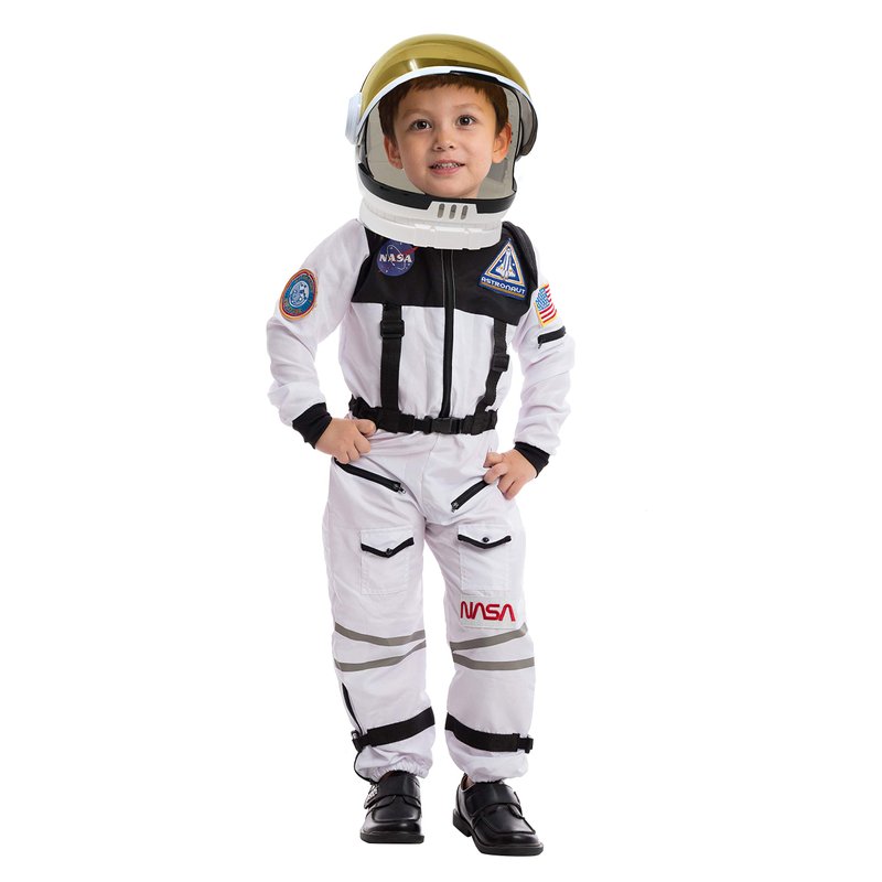 - Astronaut NASA Pilot Costume Includes a White Full-Length Body Jumpsuit with Embroidered NASA Logo and USA Flag Patches and a Tinted Movable Visor Space Helmet.