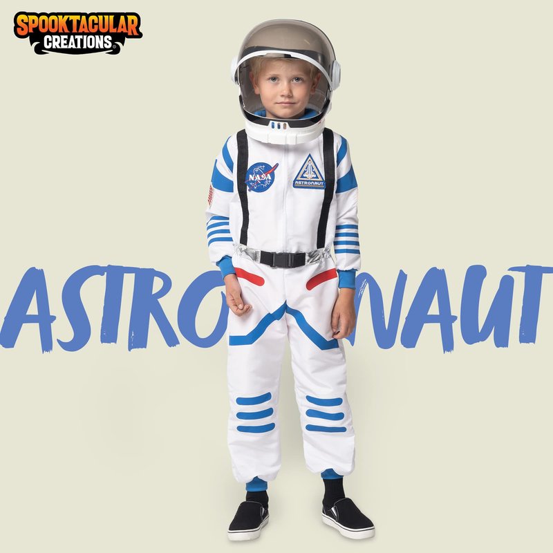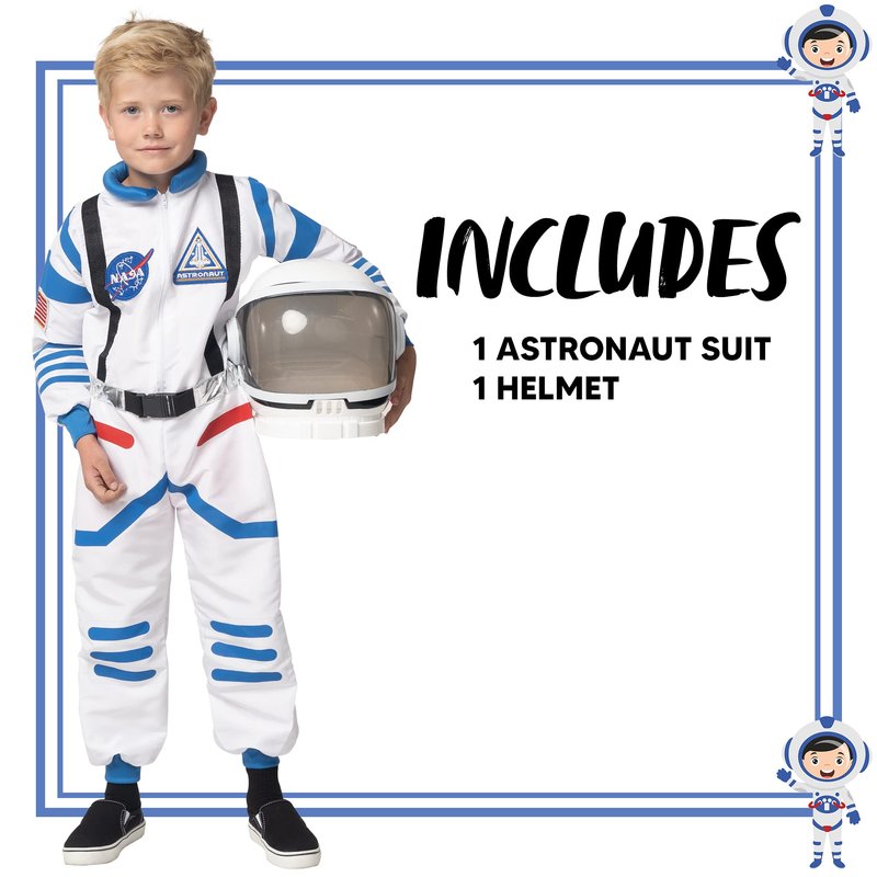 - Astronaut White Pilot Costume Includes a Helmet, a Blue Full-Length Front Zip Jumpsuit, Badge, Pocket, and have Black straps. Perfect for your little space traveler!