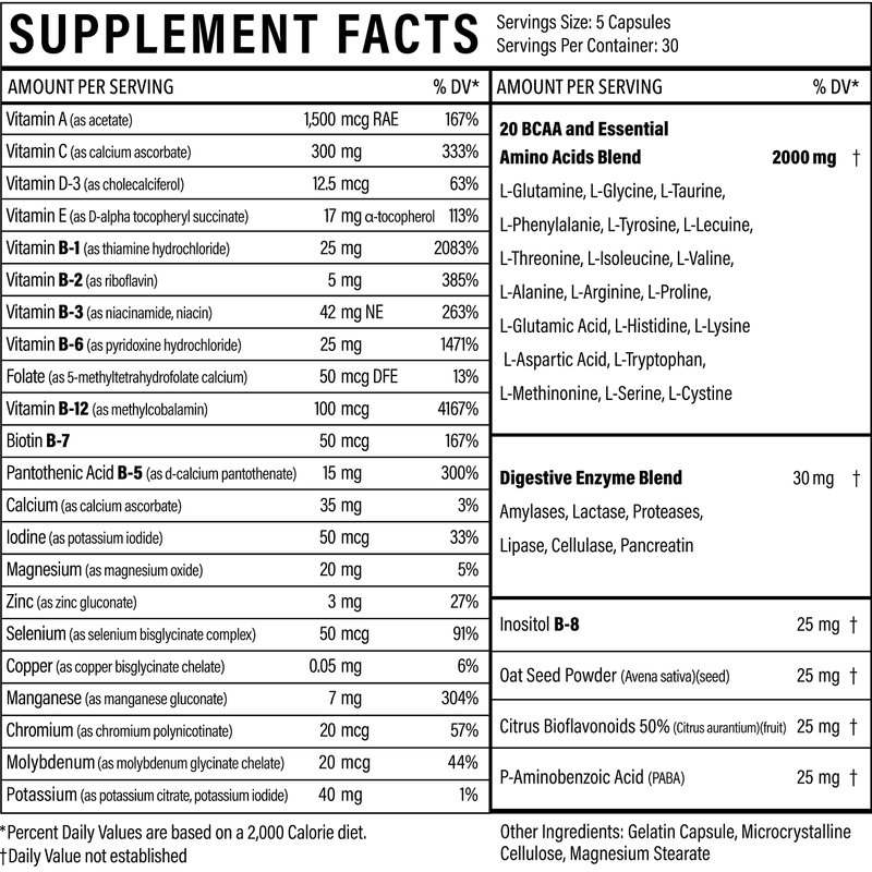 Sport Formula Daily Keto Superfood Multivitamin BCAA Amino Acid Powder Capsules for Men and Women. Won't Upset Your Stomach: Natural Vitamin B Energy Complex: Anti Aging Immune System Support