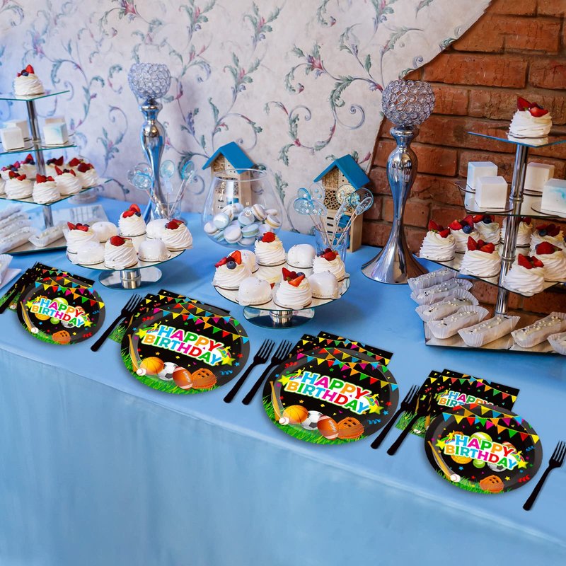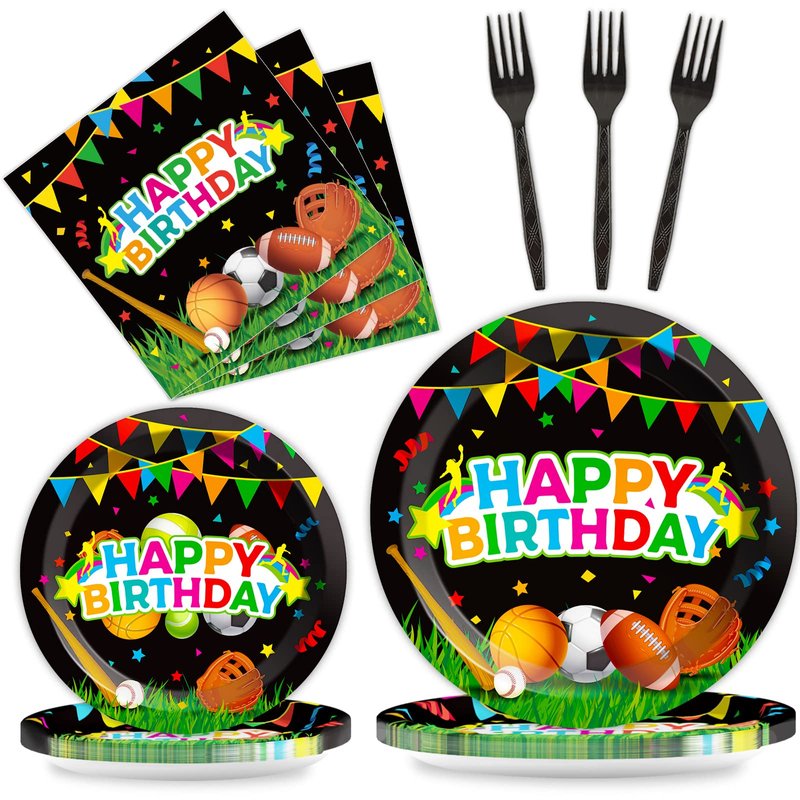 - 【Sports Party Supplies Serves 24】 This sports theme birthday party supplies set includes: 24 plates (9inch) + 24 plates (7inch) + 24 napkins (13inch) + 24 forks, there are a total of 96 pieces in this set, which will add fun to any birthday party