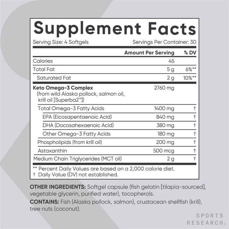 Sports Research Keto Omega Fish Oil with Wild Sockeye Salmon, Antarctic Krill Oil, Astaxanthin & Coconut MCT Oil - 1200mg of EPA & DHA per Serving | Keto Certified & Non-GMO Verified (120 Softgels)