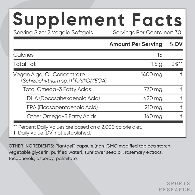 Sports Research Vegan Omega-3 Fish Oil Alternative from Algae Oil - Highest Levels of Vegan DHA & EPA Fatty Acids | Non-GMO Verified & Vegan Certified - Fresh Lemon Scent - 60 Veggie Softgels
