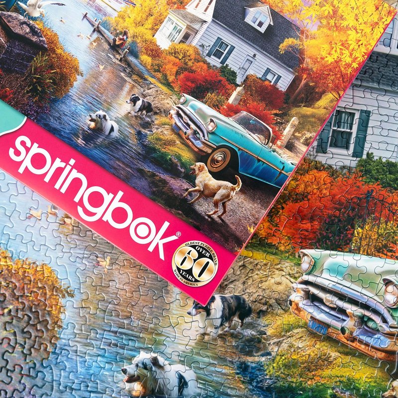 - This nostalgic autumn scene features a classic teal and white car parked in front of a quaint white house with a grey roof. Surrounded by colorful fall foliage, a serene body of water, and playful dogs, this artwork by Angelo Bonito evokes nostalgia and tranquility. This 1000 piece jigsaw puzzle for adults is perfect for those who love classic americana imagery.
