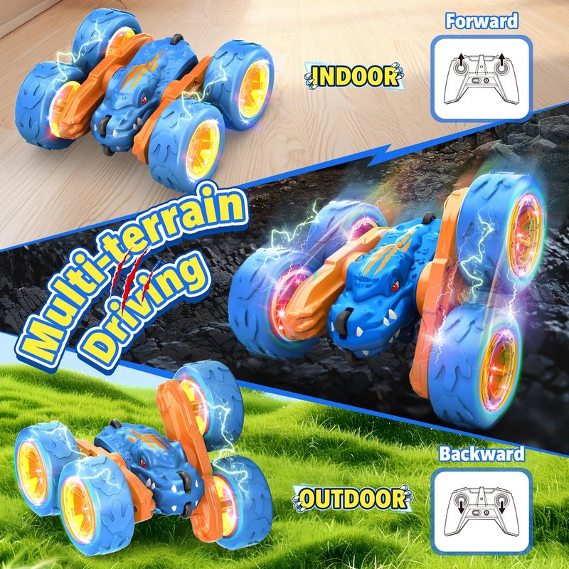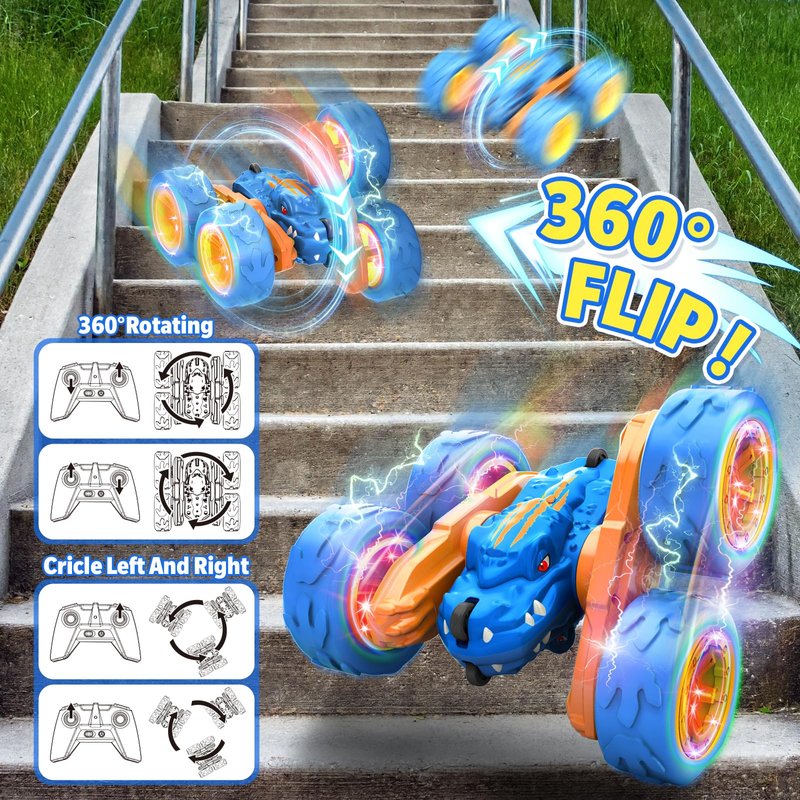 This remote control dinosaur stunt car features a unique dinosaur design with cool lights, providing endless fun for kids. It supports 360° spins and double-sided flips, with an auto-demo mode that performs exciting stunts at the push of a button. Its anti-collision and shockproof build make it perfect for various terrains like mud, sand, grass, and gravel, both indoors and outdoors. Equipped with long-lasting batteries, it enhances children's hand-eye coordination, creativity, and imagination. Packaged in an exquisite gift box, it's an ideal gift for kids ages 4-8, perfect for birthdays, Christmas, Easter, and more.