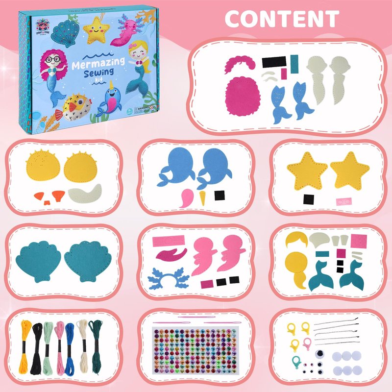 - 7 ADORABLE SEWING PROJECTS : Dive into a world of creativity with 7 cute and fun sewing projects that are perfect for all skill levels. This craft kit also includes 5 lobster clasps, 5 bead chains, 1gem sheet, and 3 Velcro pieces, perfect for decorating bags, clothes, and ornament