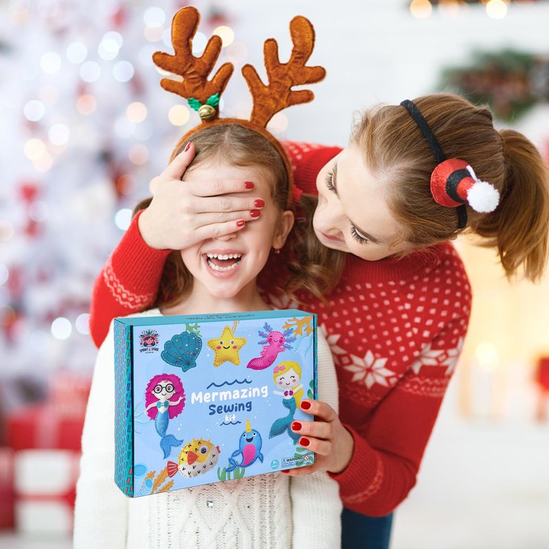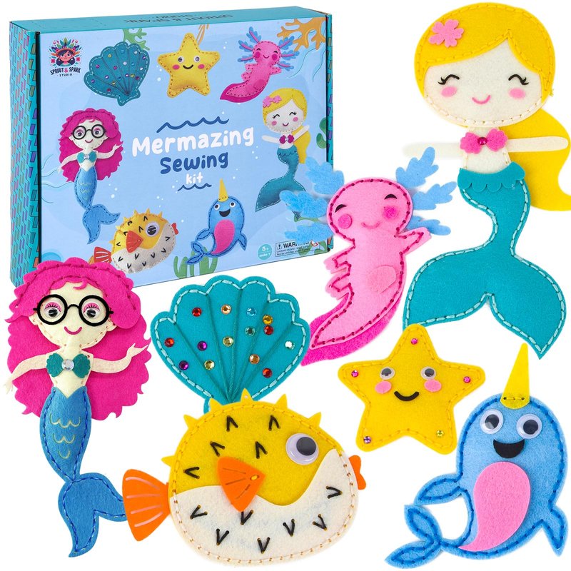 SPROUT & SPARK STUDIO Sewing Kit for Kids, DIY Set for Girls Ages 5+, Beginner,Arts and Crafts,Felt,7 Easy Projects of Stuffed Dolls, Play n Learn,Mermaid,Axolotl,