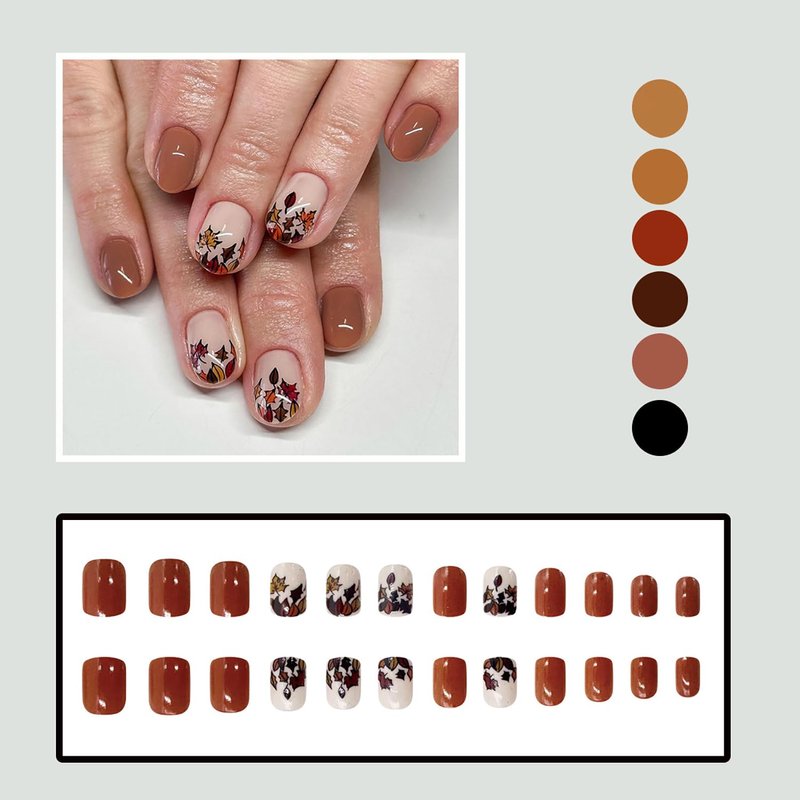 Square Fake Nails Short Press On Nails Fall False Nails With Maple Leaves Designs Brown Nails Press Ons Short Acrylic Nails Full Cover Glue On Nails Glossy Stick On Nails For Women