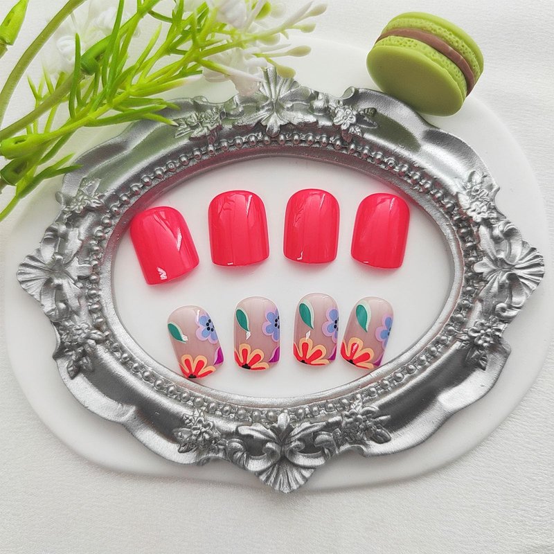 Square Press on Nails Short Fake Nails with Colorful Flower Designs Orange Red Nails Press ons Glossy Glue on Nails Acrylic False Nails Full Cover Stick on Nails for Women 24Pcs