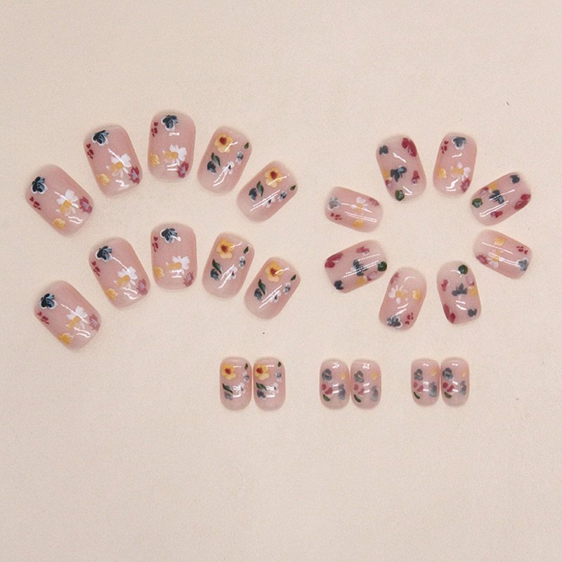 Square Press on Nails Short Fake Nails with Flower Designs Glossy Glue on Nails Cute Acrylic Nails Nude Full Cover Artificial Stick on Nails for Women 24Pcs
