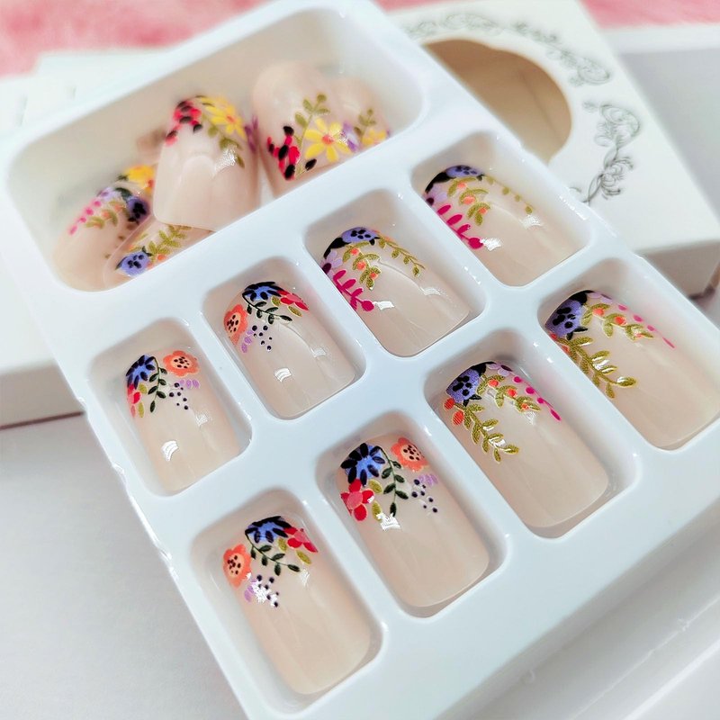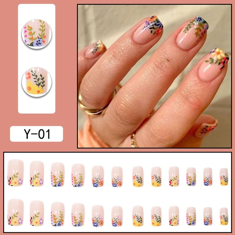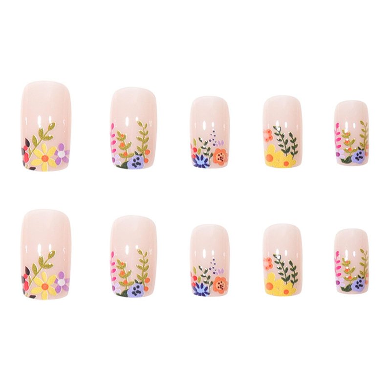 Square Press on Nails Short - TUZADNW Flower Design Short Fake Nails Press ons,24 Pcs Artificial Nude Full Cover Glue on Nails Glossy Stick on Acrylic Nails for Women