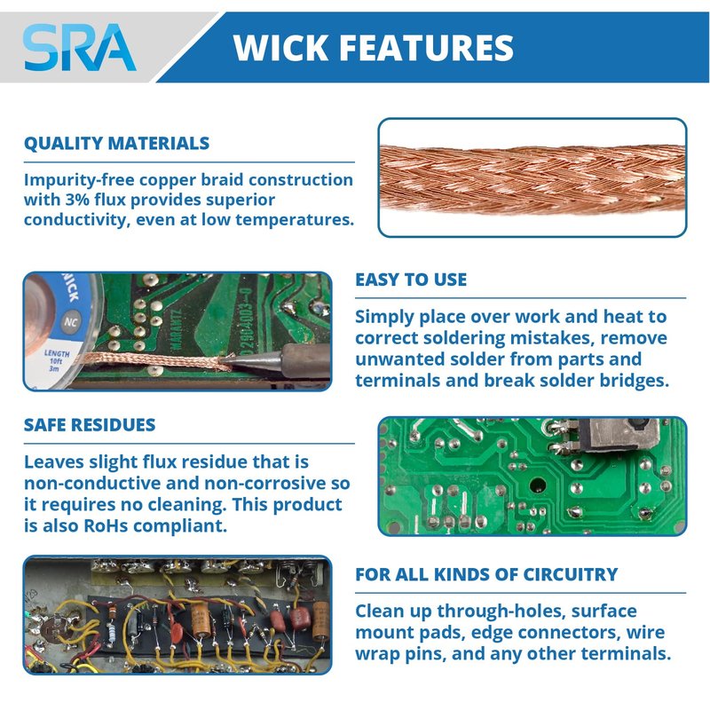 SRA Soldering Wick with Flat Woven Copper Desoldering Braid Strip and No Clean Flux for Easy Damage-Free Solder Removal - 3 Pack 10 Foot Solder Wick Spool