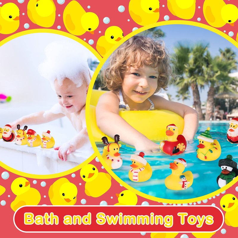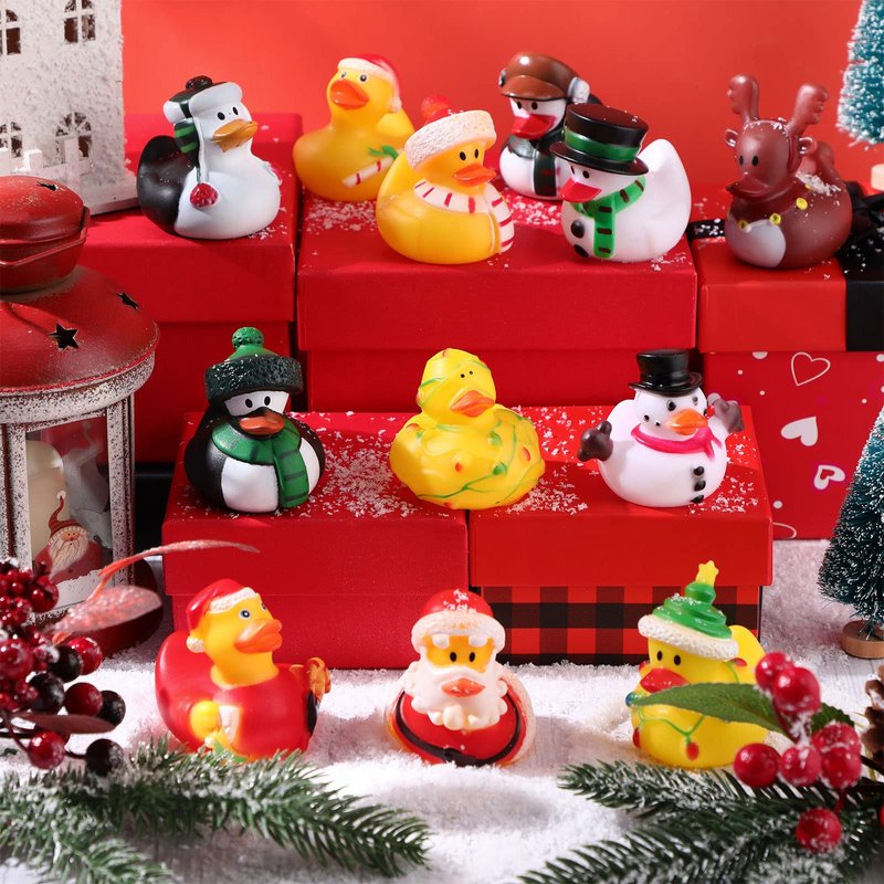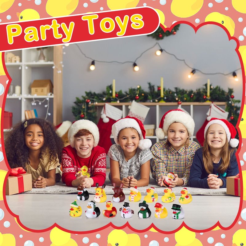 - Mini Duck Toy Bulk: includes 16 Christmas rubber ducks in different designs; the quantity is enough that you can play with your family or friends. The Christmas holiday rubber duck toy duckies are great for playing outdoors on sunny days, and will be a hit with children, especially preschoolers, during birthday parties, school carnivals or pool parties