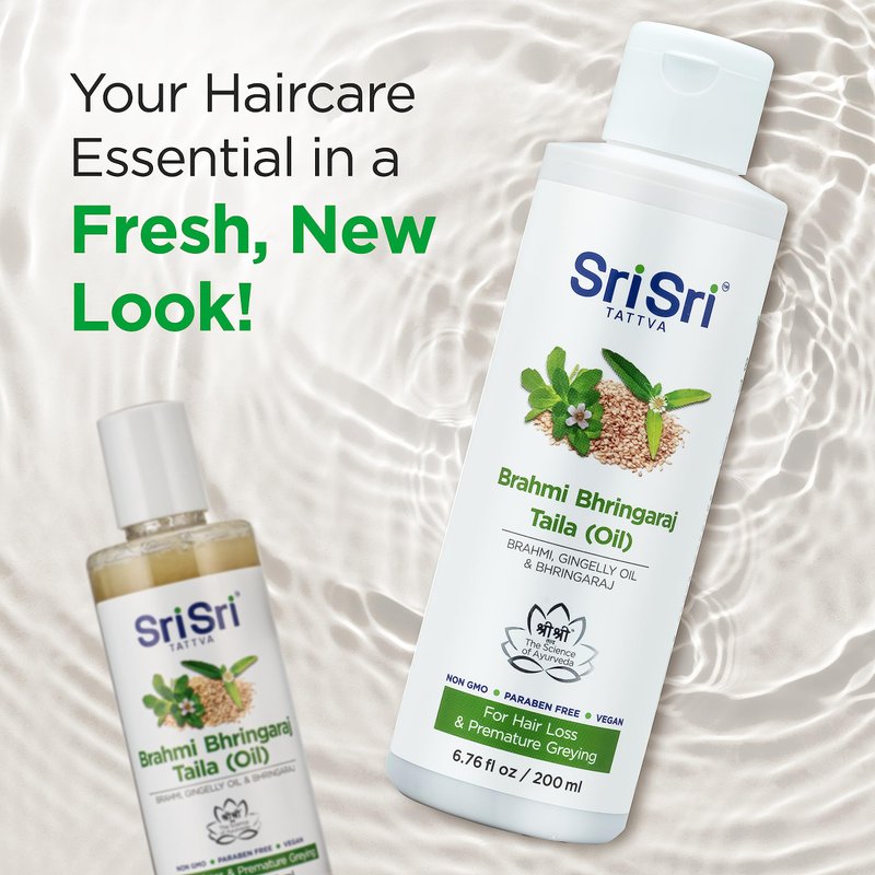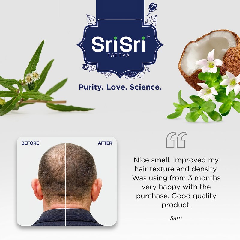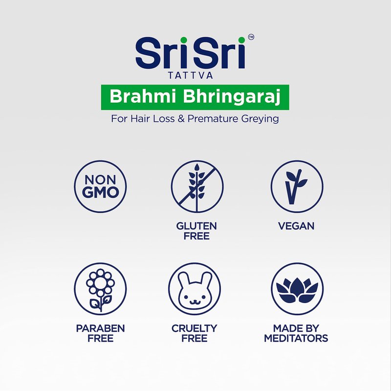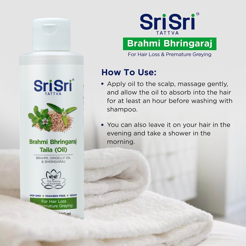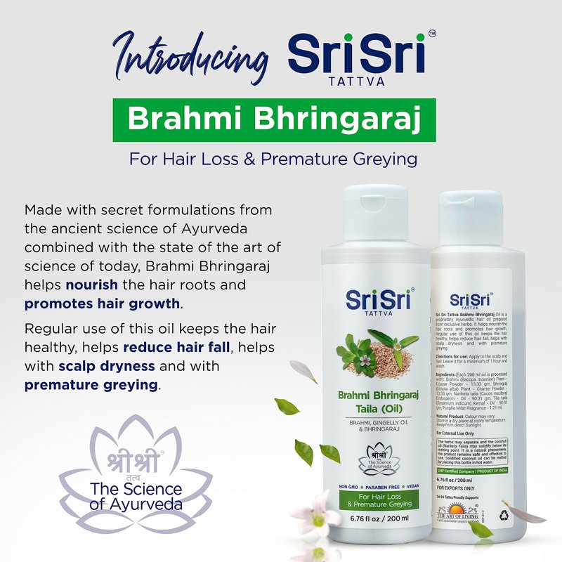 Brahmi Bhringraj oil contains the perfect blend of ingredients that help strengthen hair and nourish the scalp. Achieve smooth, shiny, voluminous hair safely and naturally with Sri Sri Tattva Brahmi Bhringraj Hair Growth Oil!Benefits of Using Ayurvedic Hair Oil:- Promotes hair regrowth- Helps prevent hair loss and premature graying- Strengthens hair from the roots- Removes frizz and smoothes texture- Reduces split ends and increases volume- Deeply nourishes the scalp- Helps with dandruff- Relaxes the mindIngredients: Brahmi (bacopa monnieri) plant coarse powder, 13.33 gm; Bhringaraj (eclipta alba) plant coarse powder, 13.33 gm; Narikela Taila (cocos nucifera) endosperm oil, 90.31 gm; Tila Taila (sesamum indicum) kernel oil, 90.91 gm.Recommended Usage: 3–4 times a week. One container yields 40 uses (5–10ml per use). Store in a dry place at room temperature, away from direct sunlight.Add our Brahmi oil to your daily routine and achieve stronger, healthier, more lustrous hair in no time!