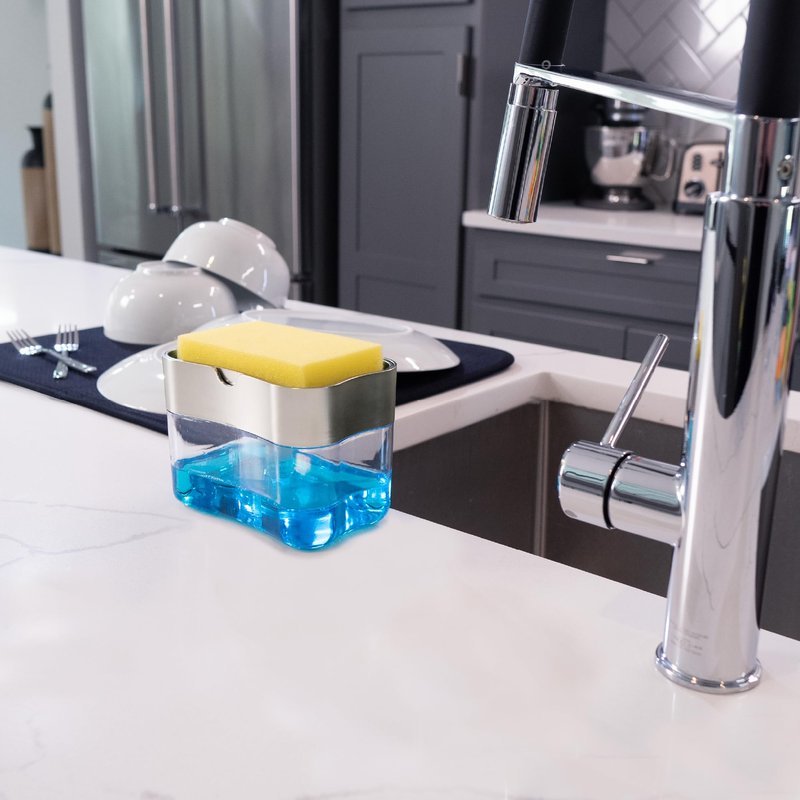 - One Metallic Silver soap dispenser for kitchen sink that provides compact storage for dish soap and dish sponge, eliminating sink clutter
