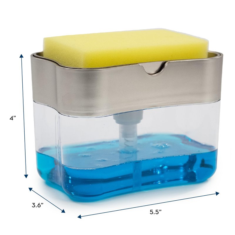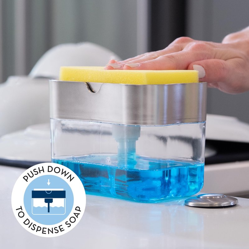 - Easily press down on the top plate on the dish detergent pump to dispense dish soap directly on to the included sponge