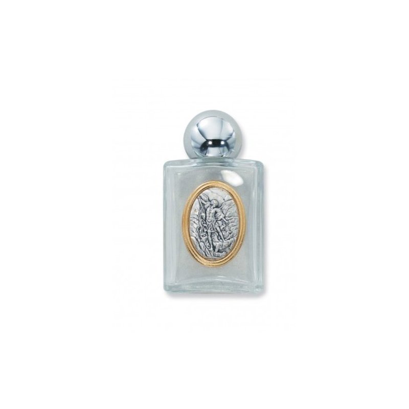 Glass holy water bottle with silver-tone cap stands approximately 3.5 tall. One ounce capacity. From McVan, Inc.