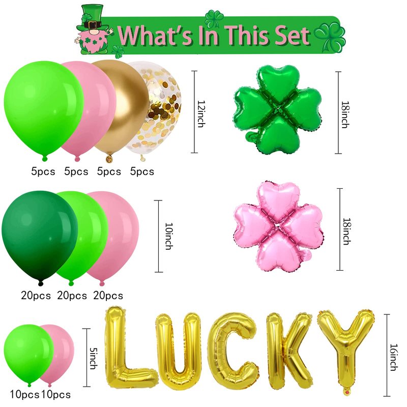 - Packing includes:20 green latex balloons 10 inches, 20 pink latex balloons 10 inches, 20 Dark green latex balloons 10 inches,5 Gold Confetti Balloons 12 inches, 5 gold latex balloons 12 inches, 5 green latex balloons 12 inches,5 pink latex balloons 12 inches,10 green latex balloons 5 inches,10 pink latex balloons 5 inches,16" gold letter balloons" LUCKY", 1 green four-leaf clover foil balloons ,1 pink four-leaf clover foil balloons ,1 balloon tape strip,1 Balloon Knotter,1 roll of 100 adhesive dots.