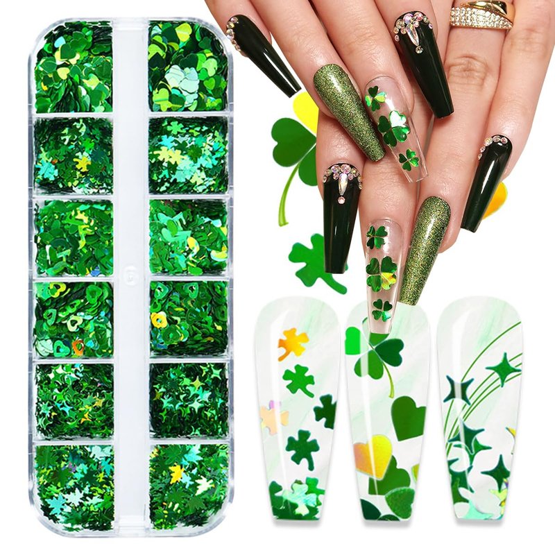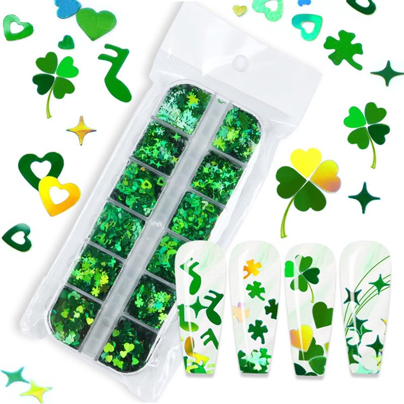 - St. Patrick's Day Nail Design: 12 grids 3D holographic nail art sequins has different designs. Each sequin nail design is packed in its own small grid, and different shape are mixed and matched can makes beautiful possibilities emerge endlessly.