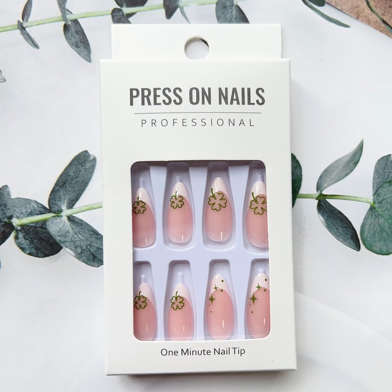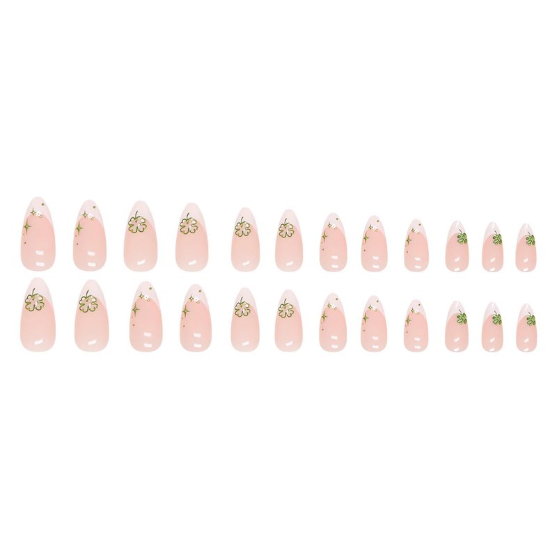 - šćSt. Patrickās Press on Nails KitćYou will get 24 pcs green lucky clover fake nails + 1 nail file + 24 pcs jelly glue stickers+1 wooden stick.(durability of jelly glue is not as good as liquid glue, but it makes fake nails reusable. Please use suitable nail glue according to different scenes)