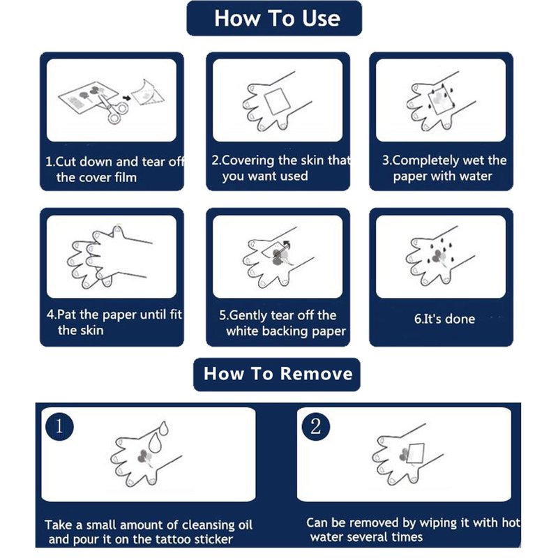- Easy to apply: Place tattoo on clean + dry skin > Lightly dab the tattoo with damp paper towel > Remove paper, allow tattoo to dry and enjoy! : )