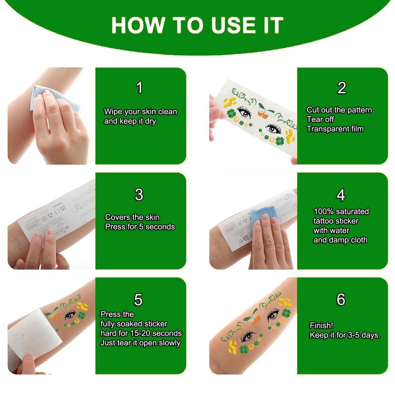 - 【Cleaning And Removal】St. Patrick's temporary tattoos are waterproof and sweatproof, and can last for 3-5 days on the surface of the skin; They can also be easily removed, remove quickly tattoos with baby oil, coconut oil, or olive oil, Just apply oil to tattoos and rub off, it's that simple!