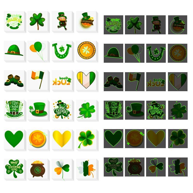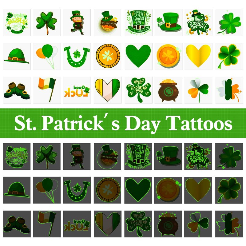 - St. Patrick’s Day Temporary Tattoos - Include 144pcs Luminous Tattoos, 6 each of the 24 designs with interesting and attractive design, Shamrocks, The Irish flag, Happy St. Patrick's Day, and more. 2 inches large size for each pattern. Great fun for st.patricks party.