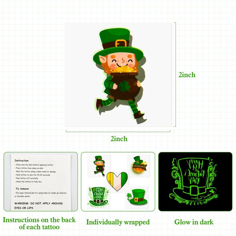 - Glow in Dark Tattoos - 144 Pcs luminous St. Patrick's Day temporary tattoos can absorb sunlight during the day and will glow in the dark. Wear them day or night in st.patrick party gathering, and change them instantly! for a unique look this St. Patrick's day, You're proud to be Irish, and it really shows when you adorn yourself with temporary tattoos!
