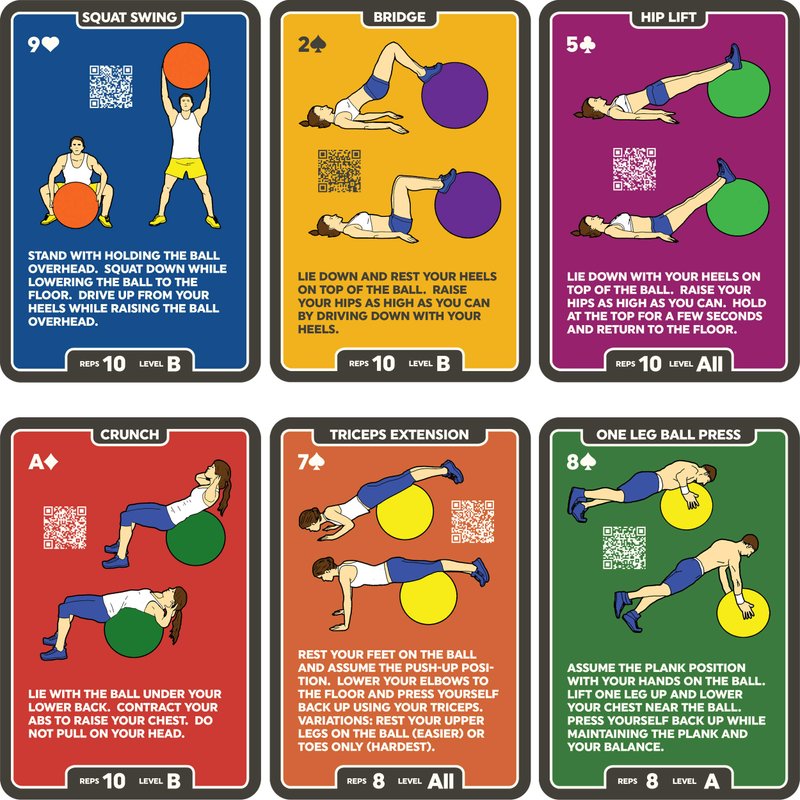 - CONTAINS: 52 of the most effective balance ball exercises on suited and numbered playing cards. Get a full body workout anywhere with only an exercise ball, no additional equipment is needed.