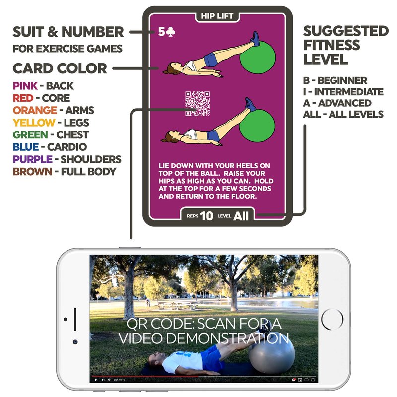 - CREATE AWESOME WORKOUTS IN SECONDS: No planning or preparation. Shuffle the deck and deal yourself a workout or play an Exercise Ball Stack 52 card game. Visit our website for free game ideas or modify your favorite card game into a workout!