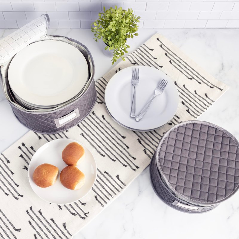 CONTENT: One plate case for small plates, 8" diameter by 6" height. It includes 12 felt plate separators for protection against chipping and scratching. PREMIUM MATERIAL: Made from Premium Polyester with non-slip texture with label holder and zippered closures. CARE: Hand wash with warm soapy water and lay flat to dry; or wipe with wet cloth as needed.