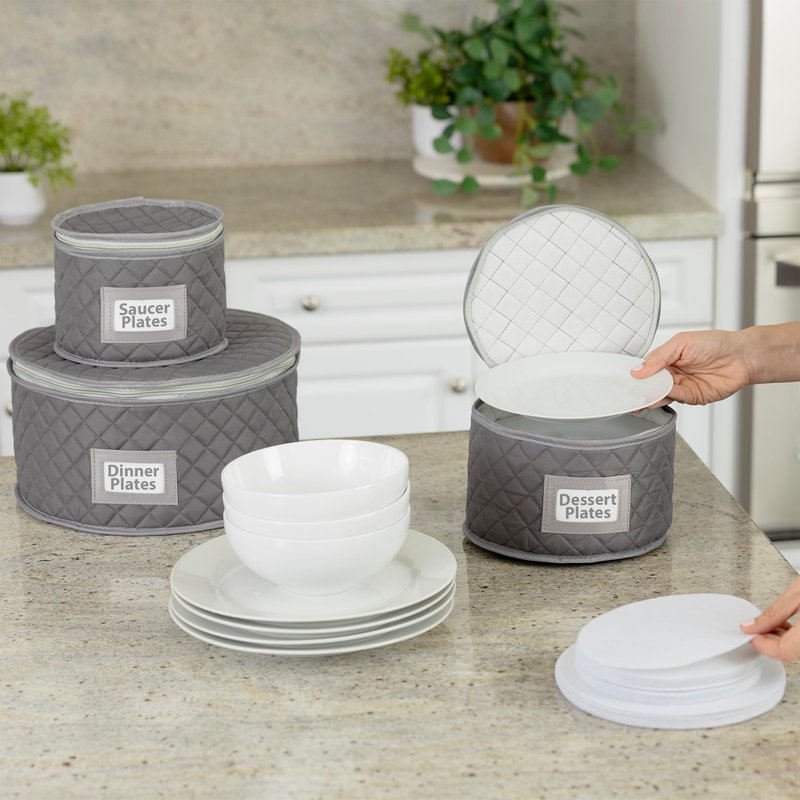 - PROTECT YOUR DINNERWARE - Dessert plate / Saucer storage case holds a set of 12 plates. Set includes 12 felt plate separators for protection against chipping and scratching.