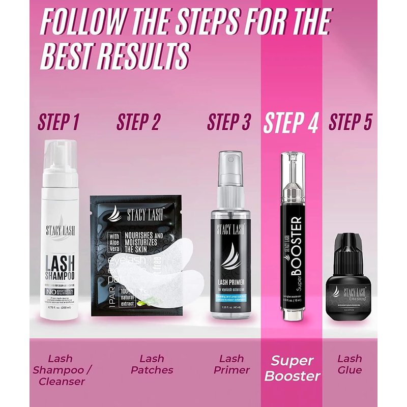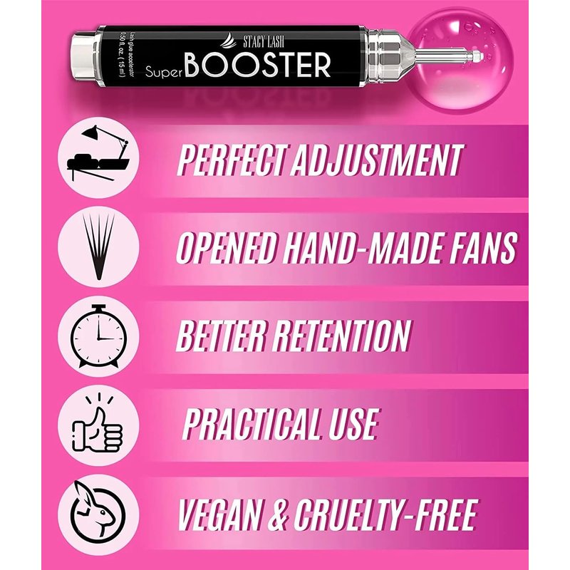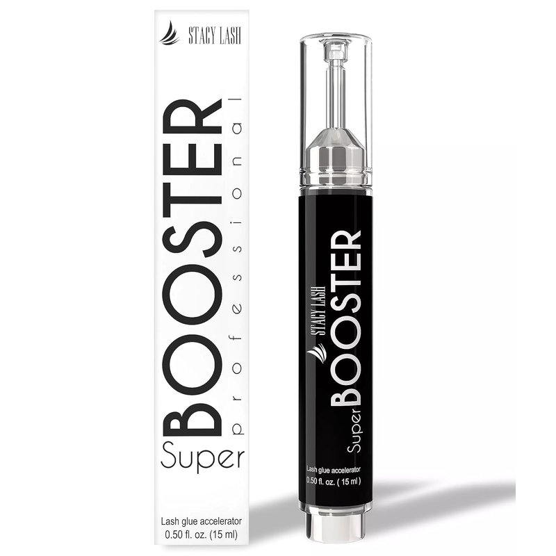 - Stacy Lash Super Booster prevents your premade fans from closing up. Your eyelash extension glue is instantly cured, which stops it from leaking and keeps your lash fans perfectly wide.