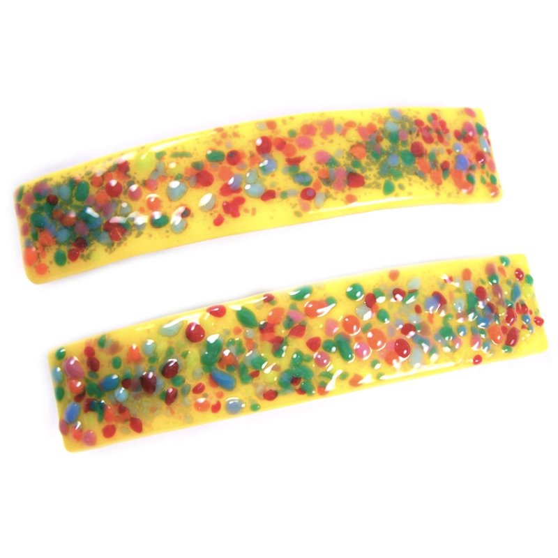 Stained Glass Barrette - 3.5" 9cm - Circus Confetti Yellow with Rainbow Speckles Polka Dot Slide Clip Hair Accessories.... Always One-of-a-kind. SOLD INDIVIDUALLY. The speckles are made with glass crumbs called "frit". So, we have gotten out the hammers, and we're having a smashing good time. This barrette is made from Tiffany style glass... LIGHT WEIGHT AND COMFORTABLE: We try to keep our barrettes light weigh and very comfortable to wear. We want you going for them every day~! Buy as singles or as pairs (when available, if you don’t see 2 of these in stock, we might be able to make a pair for you depending on our glass inventory). ABOUT OUR TIFFANY BARRETTES: This barrette is made from Tiffany style sheets of art glass... Think stained glass windows and lamps.... YUP, that’s the stuff. This is not the metallic dichroic glass we normally work with. We had some of this Tiffany glass in the closet so we made some of these “Tiffany” stained glass barrettes, and BAM... SOLD. Tried it again, and the same thing happened. It became immediately clear that people want attractive, and well-made barrettes in a variety of colors and finishes. So here you go~! We’re here to provide them. If you need multiples of specific barrette, or would like to see us make something in another size, send us a custom order request. Maybe we can hook you up. High quality French style barrette clip. Large / 3.5” inch / 90mm / 9cm. Look for our barrettes in 2.5" Small, 3.5" Large, and 1" Tiny. Available in hundreds of colors. It may just take a while for us to get them loaded into this shop. If you don't see what you want, ask us. Let's talk.
