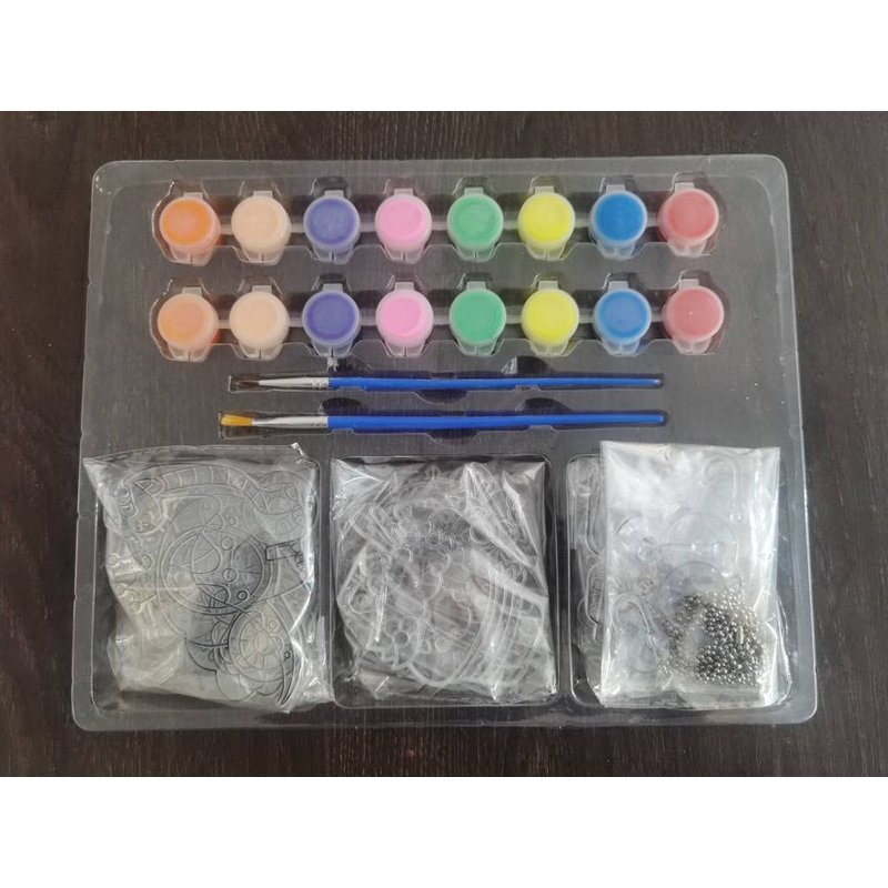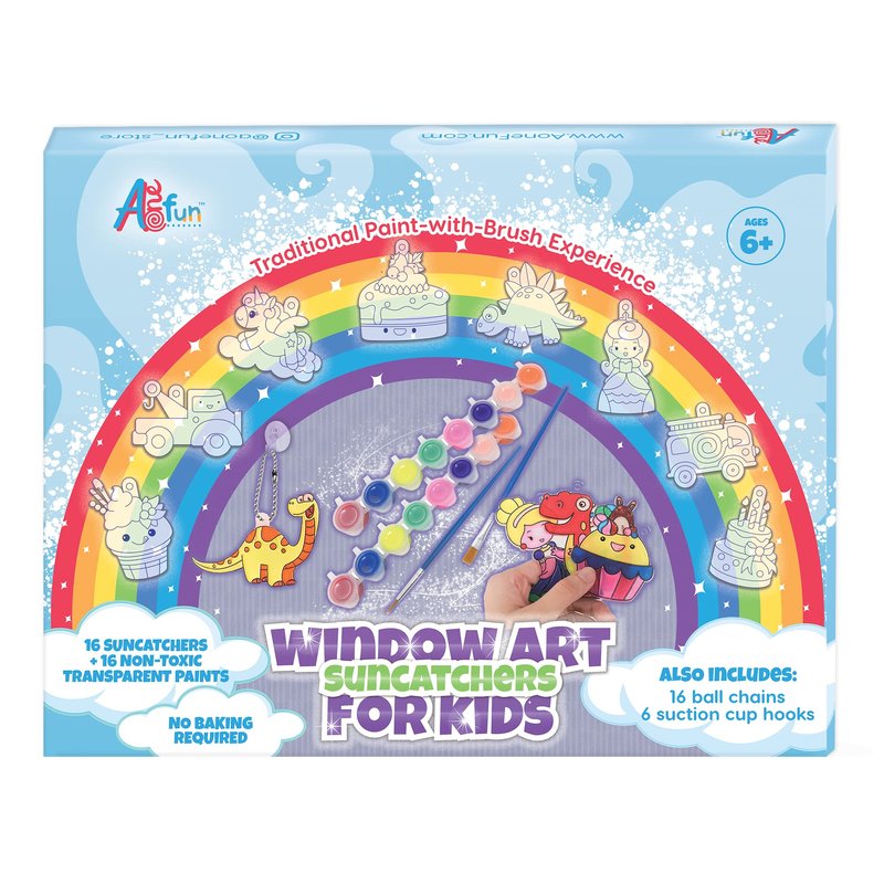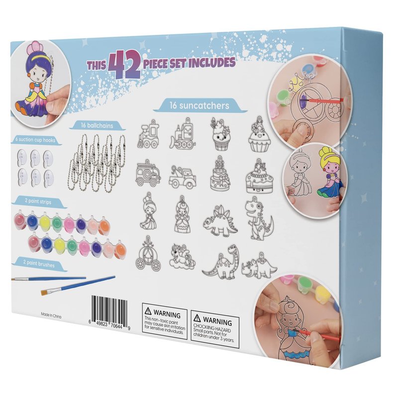 - Set includes 16 different suncatchers as pictured, 16 suncatcher paint pots, 2 paint brushes and 16 ballchains - The suncatcher (without the keyring) range in approximate measurement from 3" - 3.25"
