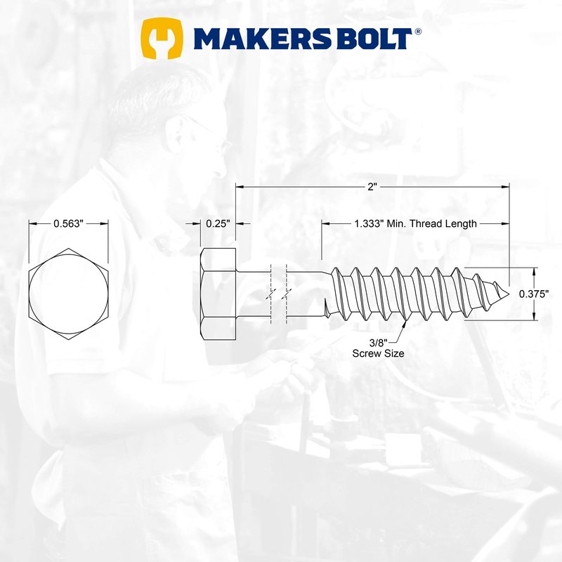Makers Bolt black lag bolts are 100% solid 18-8 (304) Certified Stainless Steel providing premium protection against rust. Our lag screws are Black Oxidized here in the USA giving these hard to find fasteners a black coating. The coating not only provides a non-reflective look, it also provides increased corrosion and abrasion resistance. The Black Oxide is applied to military spec MIL-DTL-13924D Class 4. Unlike painted, powder coated, or zinced finishes, this finish will not chip, peel, or scratch off. These black lag bolts are perfect for exterior applications where high corrosion and rust resistance is required such as deck building or manufacturing assembly equipment. Lag screws are typically used for wood applications where a heavy-duty fastener is needed to join to pieces of wood or attach metal to wood. Pair these with our stainless-steel fasteners to distribute the load and protect the material under the head of the fasteners. Drill a pilot hole before installing the lag screws to prevent the head from breaking under torque. Our fasteners are not only made from certified 18-8 stainless steel, the specialty finish will give your project a unique touch.