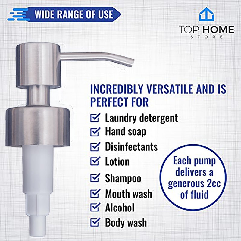 Constructed for high longevity from real metal, not plated plastic! 304 Stainless steel, with an internal stainless steel spring and glass ball for years of quality performance. The Soap pump's delivery is 2cc and has a thread size of 28/400. The tube size is 9 inch and can be cut easily to the desired length. The contents include 2 Stainless Steel Soap Pumps, and 2 nine inch Tubes