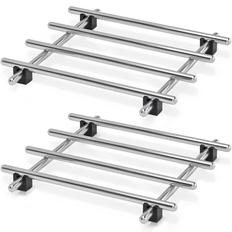2Pcs Kitchen Dining Table Runner Heat Resistant Pad Instant Countertop Kitchen Trivets for Hot Dishes: This cast iron pot holder is made of from the premium quality stainless steel, which is durable and sturdy for long period use, these trivets for hot dishes decorative have rubber feet for strong grip on glass table. These pot trivets heat resistant have super elegant design bring the simple but luxurious decor to the dining table also to countertop of your kitchen, the lifted design of our metal trivets for hot dishes can protect the heat transfer and burns and strong hold on tables. In the pack you will receive 2 pieces of stainless steel kitchen trivet. These trivets for table heat protector are about 7 inches wide and 7 inches, this square kitchen table pad perfect for various size of pots. Plastic feet of instant pot accessories prevent scratching and make it non heat-conducting lift hot dishes and bakeware off tables and countertops, preventing burns, scorches, and discoloration from the heat. The cast iron accessories have smooth edges and solid gauge, without rough spots. Specifications: Material: Stainless Steel and Rubber Color: Silver Size: 7L x 7W inches Package Includes: 2 x Stainless Steel Trivet