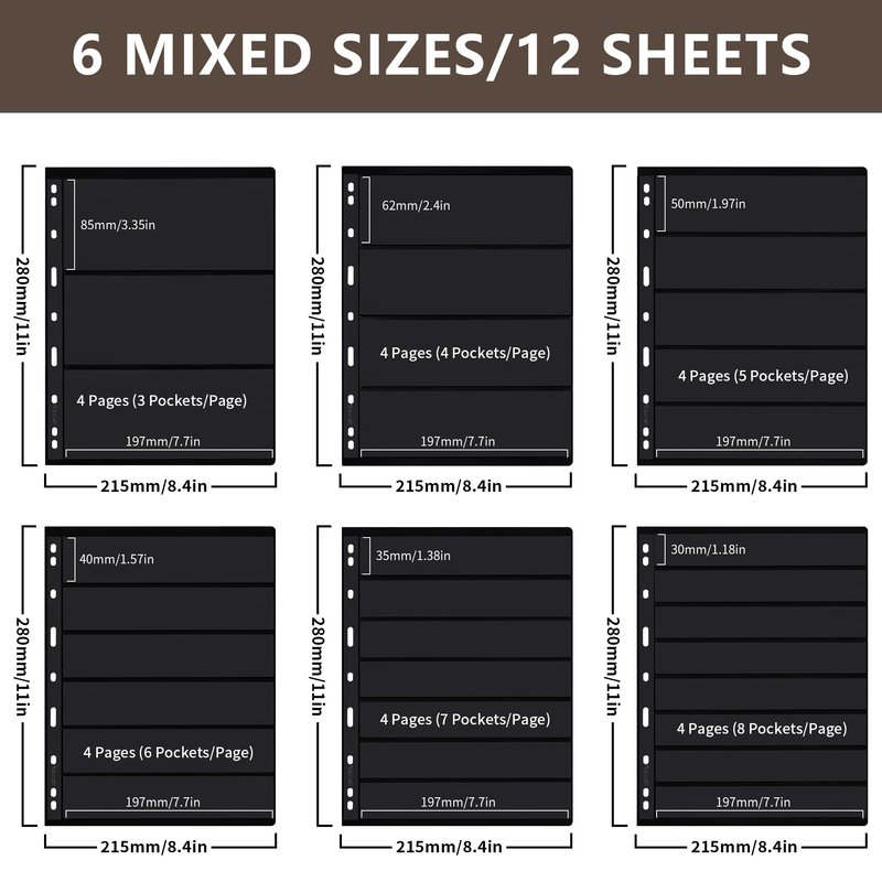 - PROFESSIONAL STAMP POCKET - Each pack of 12 sheets with 24 pages, 6 mixed sizes and 2 sheets of each size, suitable for stamps with height under 85MM
